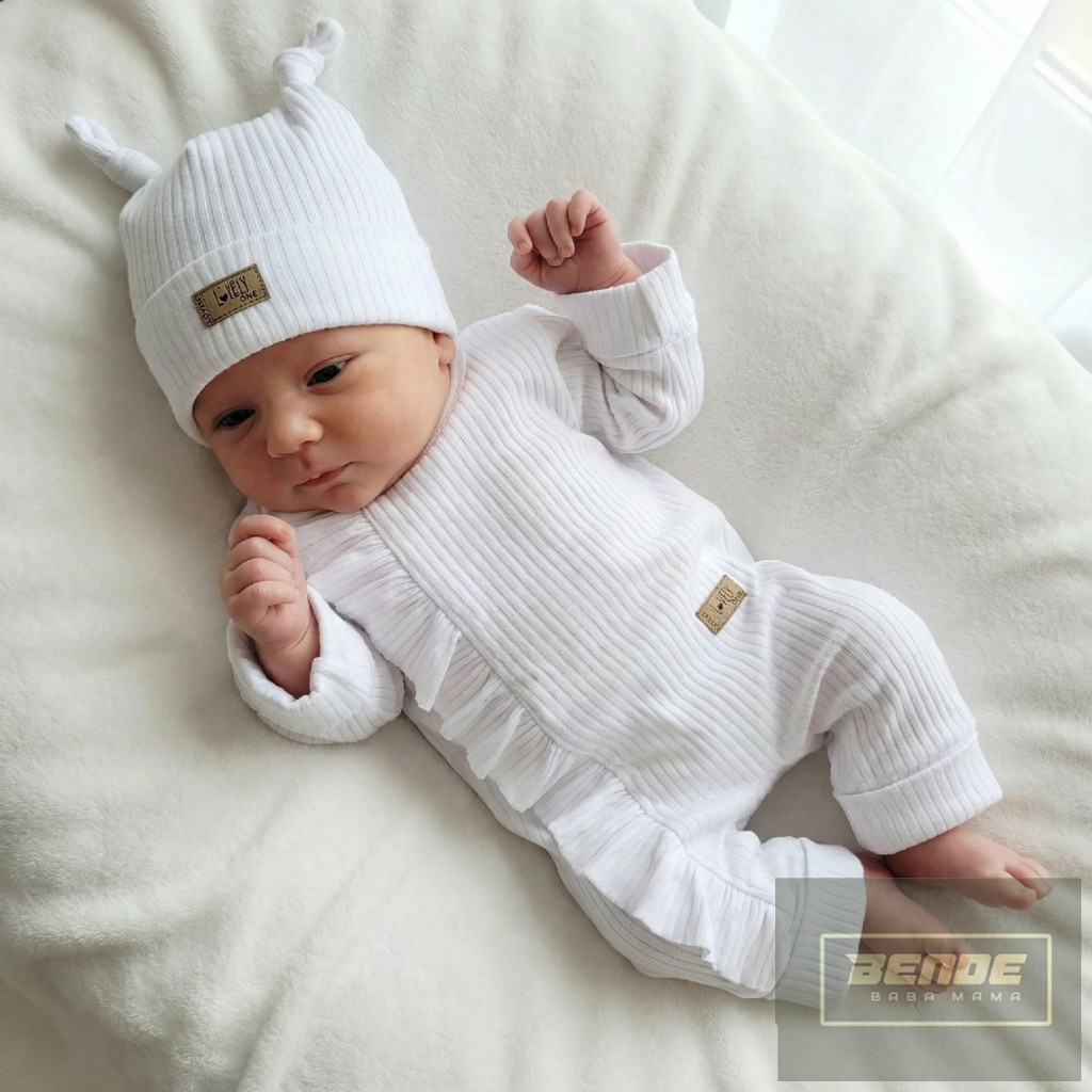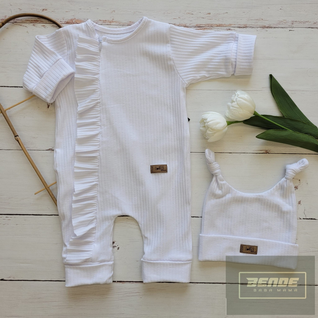 Kazum 2 részes baba szett ,cipzáras fodros rugdalózó és sapka-fehér