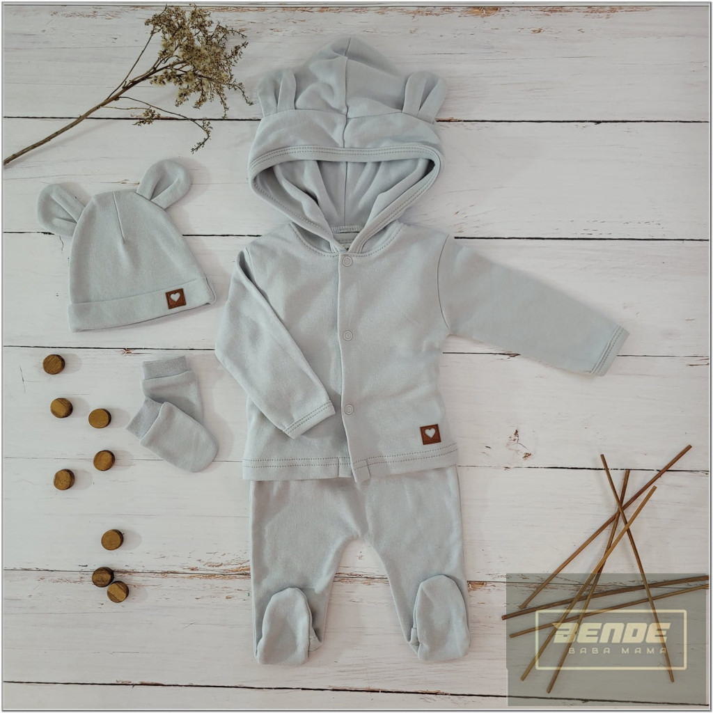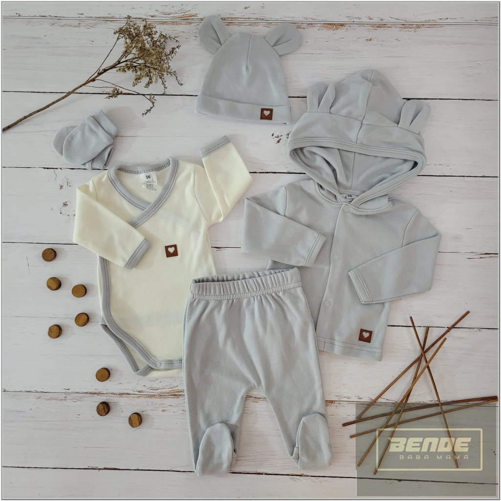 Zyzio&Zuzia 5 részes babakelengye szett:body+nadrág+sapka+kesztyű+kabát -szürke